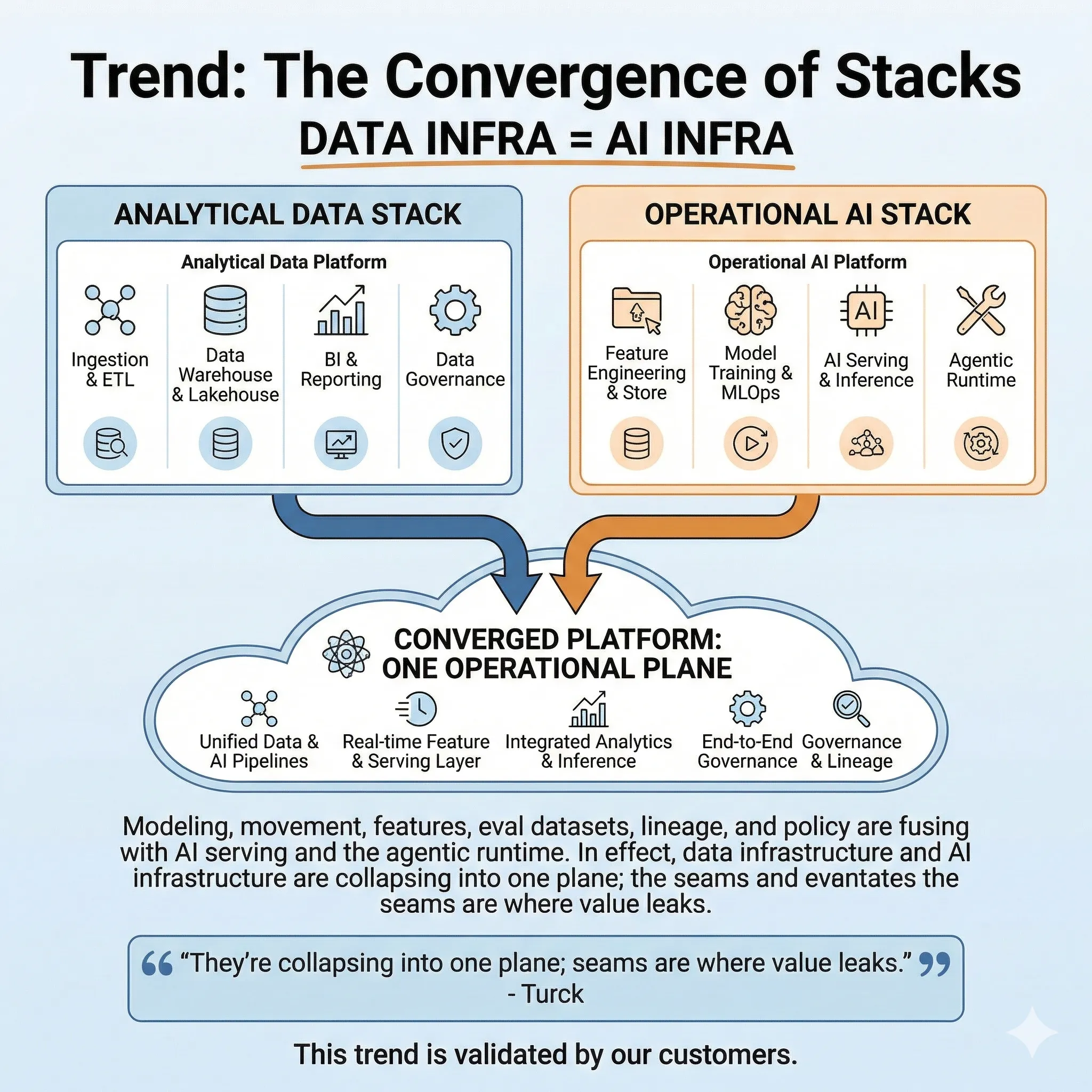 Data Infra Implication: The modern data platform must be a unified engine, providing SQL analytics, vector search, and real-time processing as integrated capabilities. The goal is to eliminate the cost and latency of moving data between separate systems.