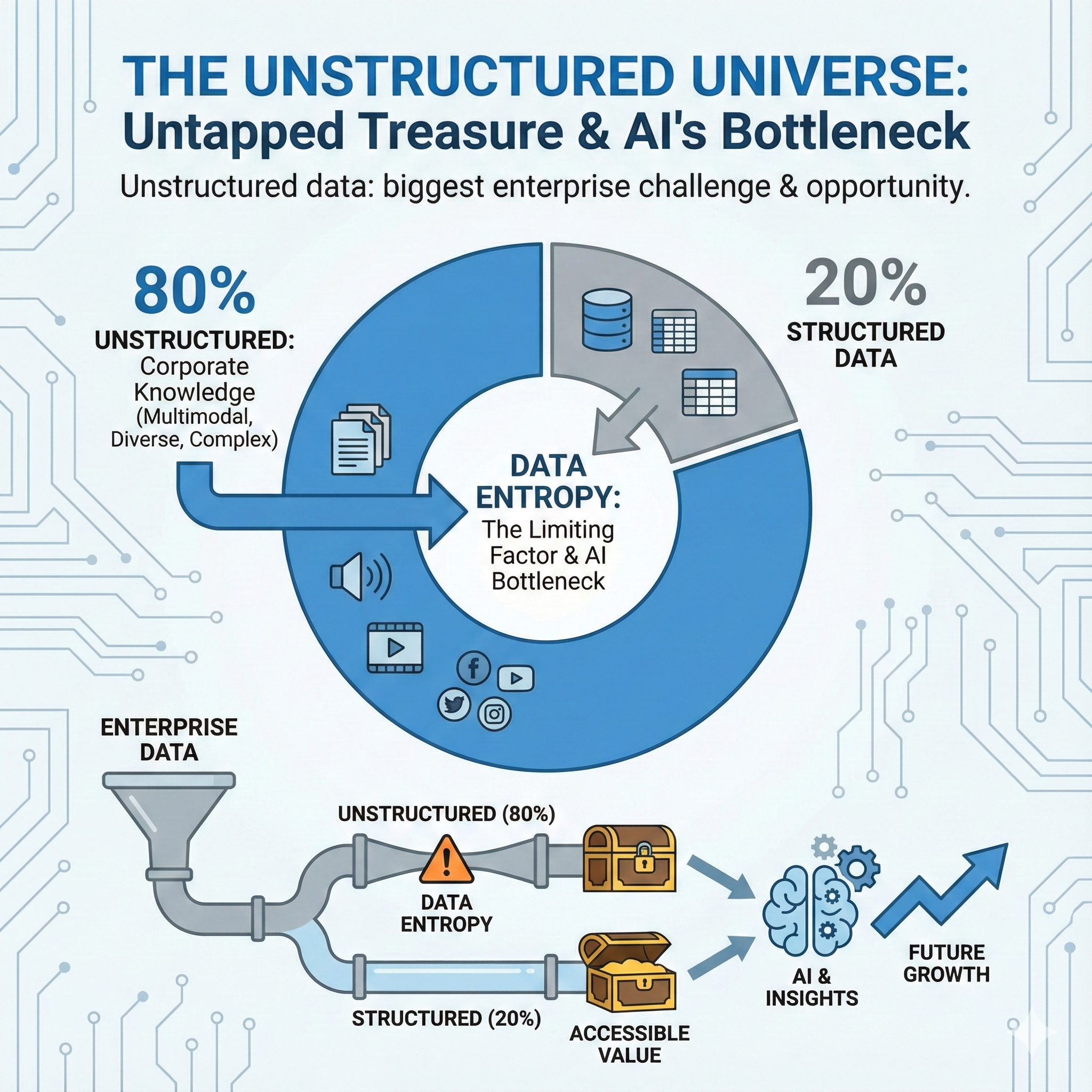 For decades, data engineering has primarily focused on structured data. That era is over. The vast majority of enterprise knowledge—estimated at 80%—is locked away in what a16z calls the "unstructured universe": a chaotic sludge of PDFs, images, videos, and logs [3]. In 2026, the primary challenge for data engineers is to tame this universe and transform unstructured content into structured, AI-ready assets.